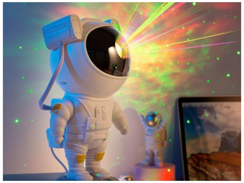Projektor má tvar přátelského astronauta, který dodává interiéru okouzlující a zábavný prvek.