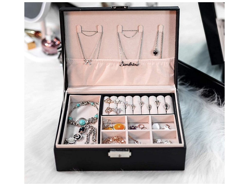 Velká, velmi prostorná schránka pro uspořádání všech typů šperků a hodinek. Organizér je vybaven různými typy a velikostmi přihrádek , které úspěšně pojmou velké množství prstenů, řetízků, náušnic, náramků atd.